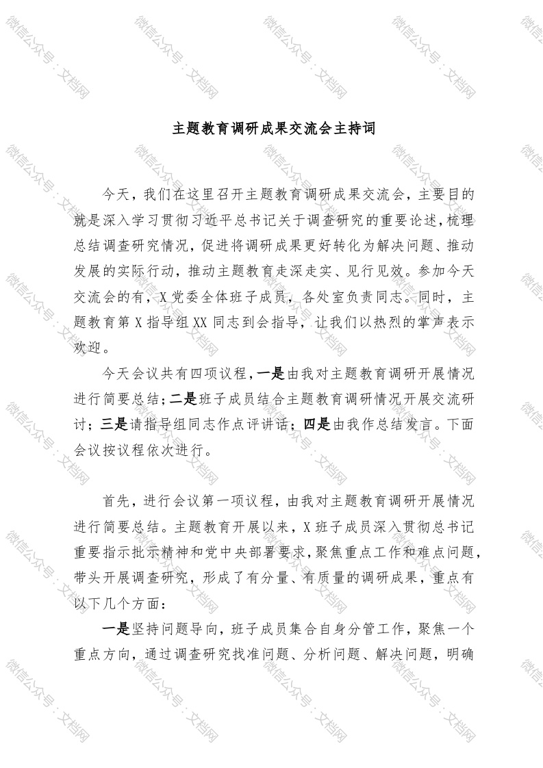 微信公众号:文档网微信公众号:文档网微信公众号:文档网微信公众号:文档网信主题教育调研成果交流会主持词微信公众微信公从微信公众号微信今天,我们在这里召开主题教育调研成果交流会,主要目的总结调查研究情况,促进将调研成果更好转化为解决问题、推动发展的实际行动,推动主题教育走深走实、见行见效。参加今天微信公众号交流会的有,X党委全体班子成员,各处室负责同志。同时,主题教育第X指导组X同志到会指导,让我们以热烈的掌声表示欢迎。档网档网档网今天会议共有四项议程,一是由我对主题教育调研开展情况进行简要总结;二是班子成员结合主题教育调研情况开展交流研微信公众号讨;三是请指导组同志作点评讲话:四是由我作总结发言。下面微信会议按议程依次进行。文档网档网:文档网:文档网首先,进行会议第一项议程,由我对主题教育调研开展情况进行简要总结。主题教育开展以来,X班子成员深入贯彻总书记微信公众号重要指示批示精神和党中央部署要求,聚焦重点工作和难点问题,带头开展调查研究,形成了有分量、有质量的调研成果,重点有以下几个方面:档网文档网文档网一是坚持问题导向,班子成员集合自身分管工作,聚焦一个重点方向,通过调查研究找准问题、分析问题、解决问题,明确微信公众号:文档网微信公众号:文档网微信公众号:文档网微信公众号:文档网