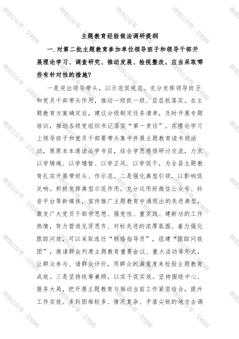 微信公众号:文档网微信公众号微信公众号微信公众号:文档网信主题教育经验做法调研提纲一.对第二批主题教育参加单位领导班子和领导干部开展理论学习、调查研究、推动发展、检视整改,应当采取哪些有针对性的措施?微信公众号信公众号一是突出领导带头,以示范促规范。充分发挥领导班子题教育方案确定后,建议分级制定任务清单,及时开展专题培训,推动各级党组织书记落实“第一责任”。在理论学习微信上领导班子和党员千部要带头集中牙展主题教育读书班活以学铸魂、以学增智、以学正风、以学促干,为全县主题教育扎实开展带好头、作示范。二是强化典型引领,以影响促反响。积极发挥典型示范作用,充分运用好微信公众号、抖平台等新媒体,宣传推广主题教育申涌现出的先进典型,档发广大党员干部学思想、强党性、重实践、建新功的工作热情,努力营造见贤思齐、对标先进的浓厚氛围。着力强化微信公众号跟踪问效,可以采取选任“联络指导员”,组建“跟踪问效团”,邀请群众列席主题教育重要会议、重大活动等形式,冷让群众参与、请群众评价,用群众的满意度来检验主题教育成效。三是坚持统筹兼顾,以实千促实效。坚持围绕中心、服务大局,把开展主题教育与推动当前工作紧密结合,提升微信公众号:文档网工作实效。多到困难较多、情况复杂、矛盾尖锐的地方去调:文档网号:文档网:文档网