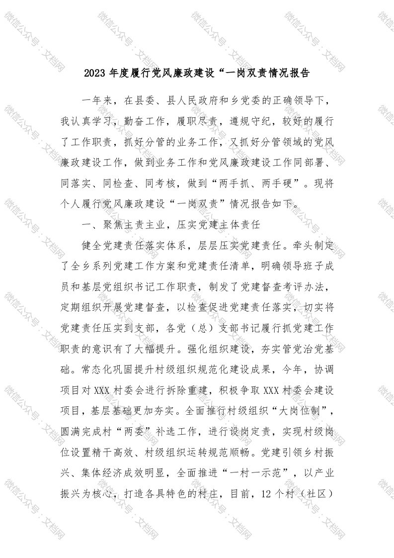 微信公众号:文档网微信公众号微信公众号:文档微信公众号:文档网2023年度履行党风廉政建设“一岗双责情况报告一年来,在县委、县人民政府和乡党委的正确领导下,微信我认真学习,勤奋工作,履职尽责,遵规守纪,较好的履行了工作职责,抓好分管的业务工作,又抓好分管领域的党风同落实、同检查、同考核,做到“两手抓、两手硬”。现将微信公众号:文档网个人履行觉风康政建设“一岗双责”情况报告如。微信一、聚焦主责主业,压实党建主体责任全乡系列党建工作方案和党建责任清单,明确领导班子成员和基层党组织书记工作职责,制发了党建督查考评办法,定期组织开展党建督查,以检查促进党建责任落实,切实将党建责任压实到支部,各党(总)支部书记履行抓党建工作础。常态化巩固提升村级组织规范化建设成果,今年,协调微信公众项目对XXX村委会进行拆除重建,积极争取XXX村委会建设项目,基层基础更加夯实。全面推行村级组织“大岗位制”,位设置精干高效、村级组织运转规范顺畅。党建引领乡村振兴、集体经济成效明显,全面推进“一村一示范”,以产业微信公众号:文档网振兴为核心,打造各具特色的村庄,目前,12个村(社区)众号:文档网众号:文档网众号