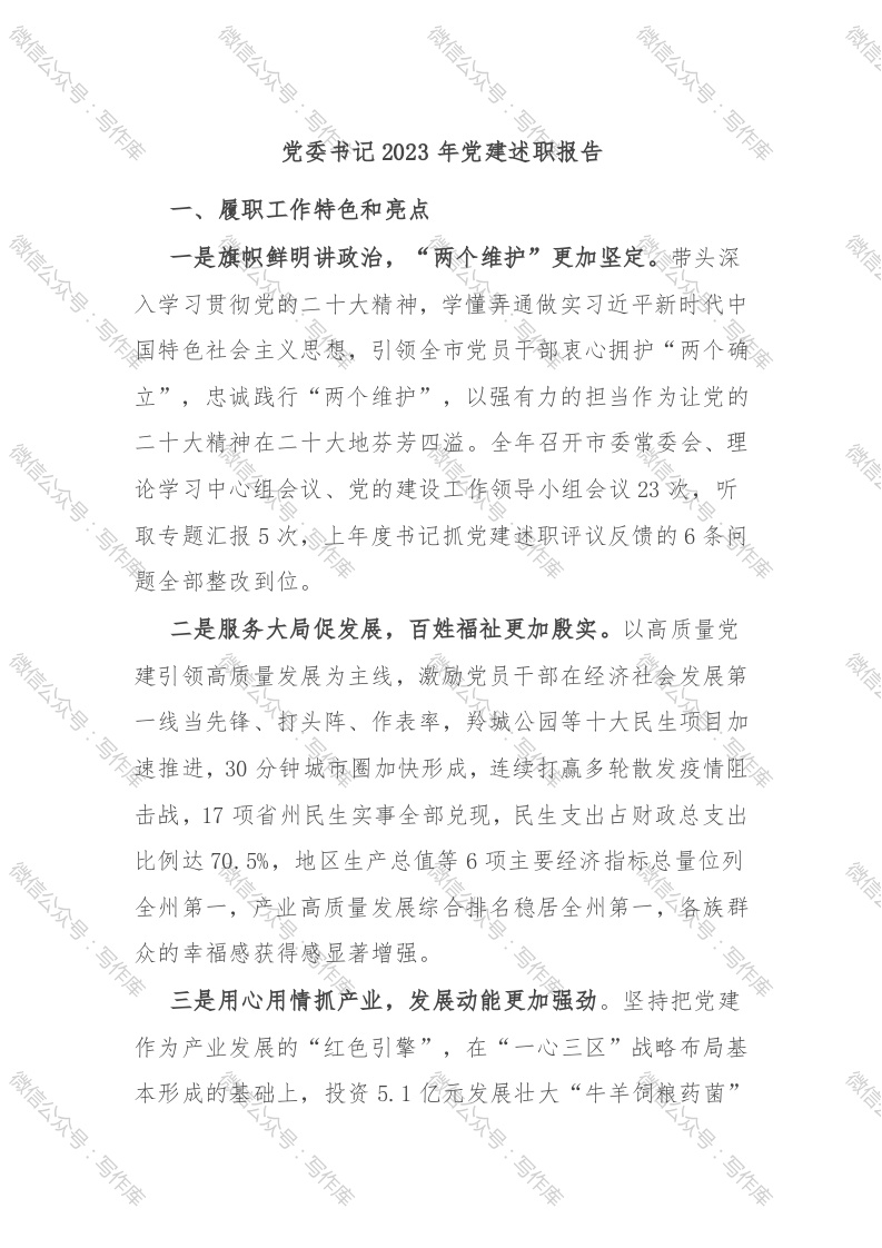 微信公众号:写作库微信公众号微信公众号:写作库党委书记2023年党建述职报告一、履职工作特色和亮点微信一是旗帜鲜明讲政治,“两个维护”更加坚定。带头深入学习贯彻党的二十大精神,学懂弄通做实习近平新时代中立”,忠诚践行“两个维护”,以强有力的担当作为让党的二十大精神在二十大地芬芳四溢。全年召开市委常委会、理微信论学习中心组会议、党的建设工作领导小组会议23次,听取专题汇报5次,⊙上年度书记抓党建述职评议反馈的6条问二是服务大局促发展,百姓福祉更加殷实。以高质量党建引领高质量发展为主线,激励党员干部在经济社会发展第线当先锋、打头阵、作表率,羚城公园等十大民生项目加击战,17项省州民生实事全部兑现,民生支出占财政总支出比例达70,5%,地区生产总值等6项主要经济指标总量位列微信公众号:写作库全州第一,产业高质量发展综合排名稳居全州第一,各族群众的幸福感获得感显著增强。写写作库三是用心用情抓产业,发展动能更加强劲。坚持把党建作为产业发展的“红色引擎”,在“一心三区”战略布局基微信公众号:写作库本形成的基础上,投资5.1亿元发展壮大“牛羊饲粮药菌”公众号:写作库公众号:写作库公众号:写作库