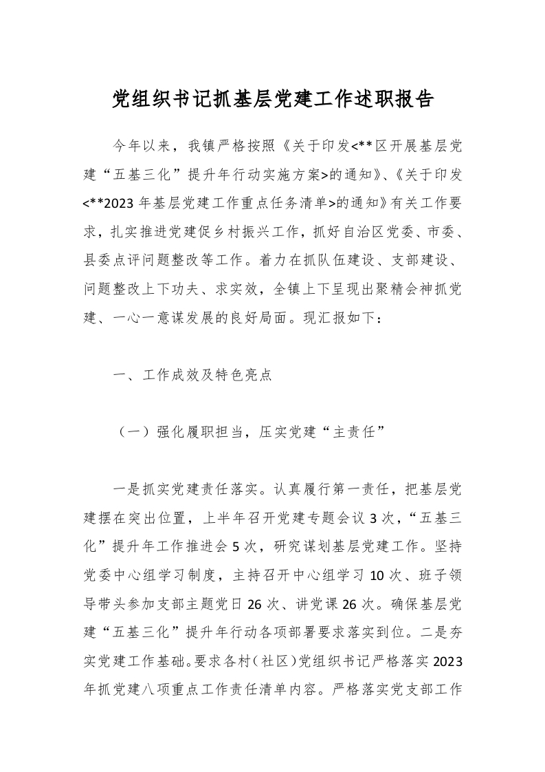 党组织书记抓基层党建工作述职报告今年以来,我镇严格按照《关于印发<*区开展基层党建“五基三化”提升年行动实施方案>的通知》、《关于印发<**2023年基层党建工作重点任务清单>的通知》有关工作要求,扎实推进党建促乡村振兴工作,抓好自治区党委、市委、县委点评问题整改等工作。着力在抓队伍建设、支部建设、问题整改上下功夫、求实效,全镇上下呈现出聚精会神抓党建、一心一意谋发展的良好局面。现汇报如下:一、工作成效及特色亮点(一)强化履职担当,压实党建“主责任”一是抓实党建责任落实。认真履行第一责任,把基层党建摆在突出位置,上半年召开党建专题会议3次,“五基三化”提升年工作推进会5次,研究谋划基层党建工作。坚持党委中心组学习制度,主持召开中心组学习10次、班子领导带头参加支部主题党日26次、讲党课26次。确保基层党建“五基三化”提升年行动各项部署要求落实到位。二是夯实党建工作基础。要求各村(社区)党组织书记严格落实2023年抓党建八项重点工作责任清单内容。严格落实党支部工作