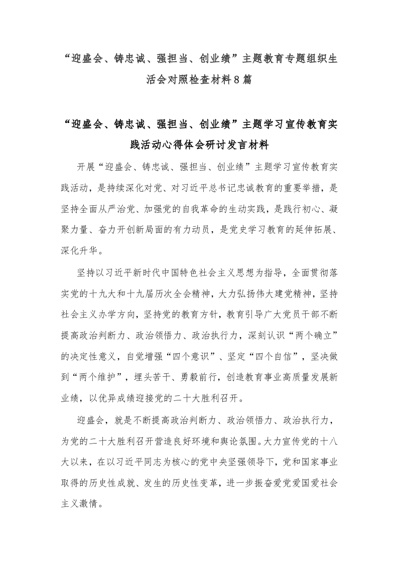 首页材料汇编(8篇)“迎盛会、铸忠诚、强担当、创业绩”主题教育专题组织生活会对照检查材料