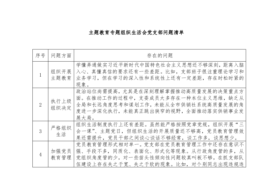 首页工作文档主题教育专题组织生活会党支部问题清单.