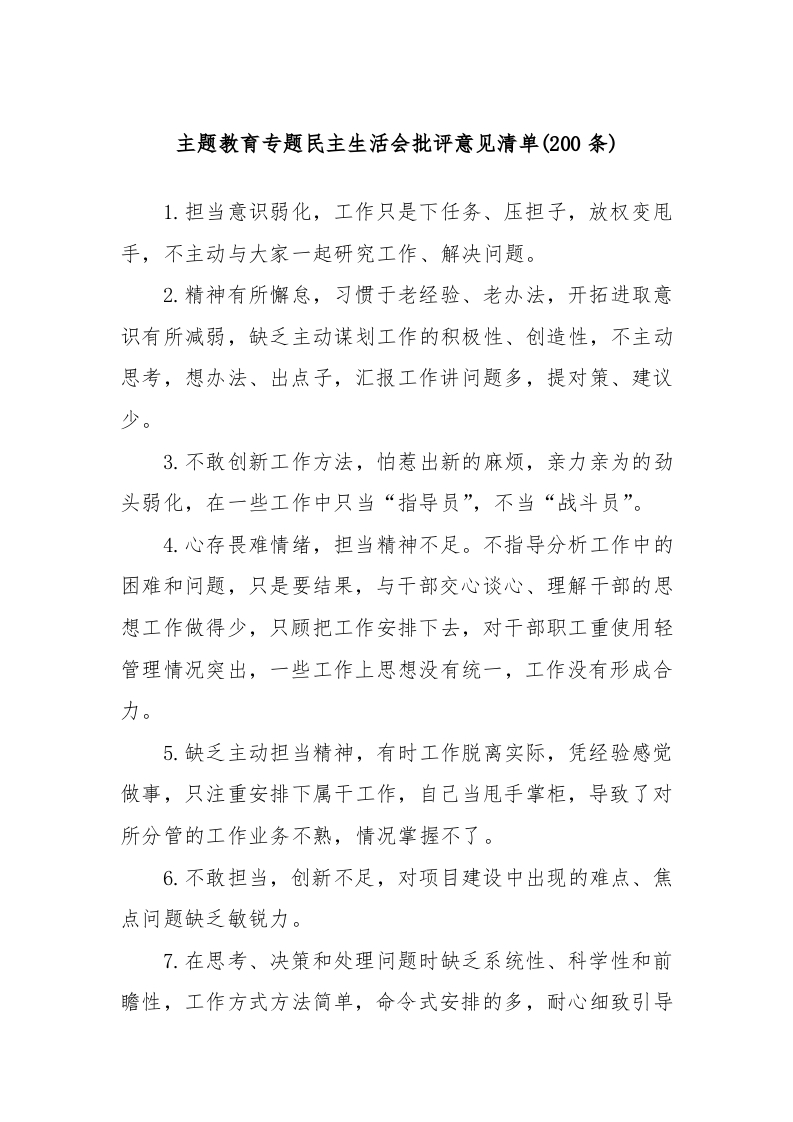 主题教育专题民主生活会批评意见清单(200条).