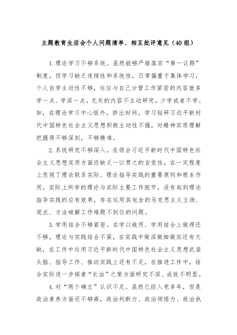 主题教育生活会个人问题清单、相互批评意见(40组)