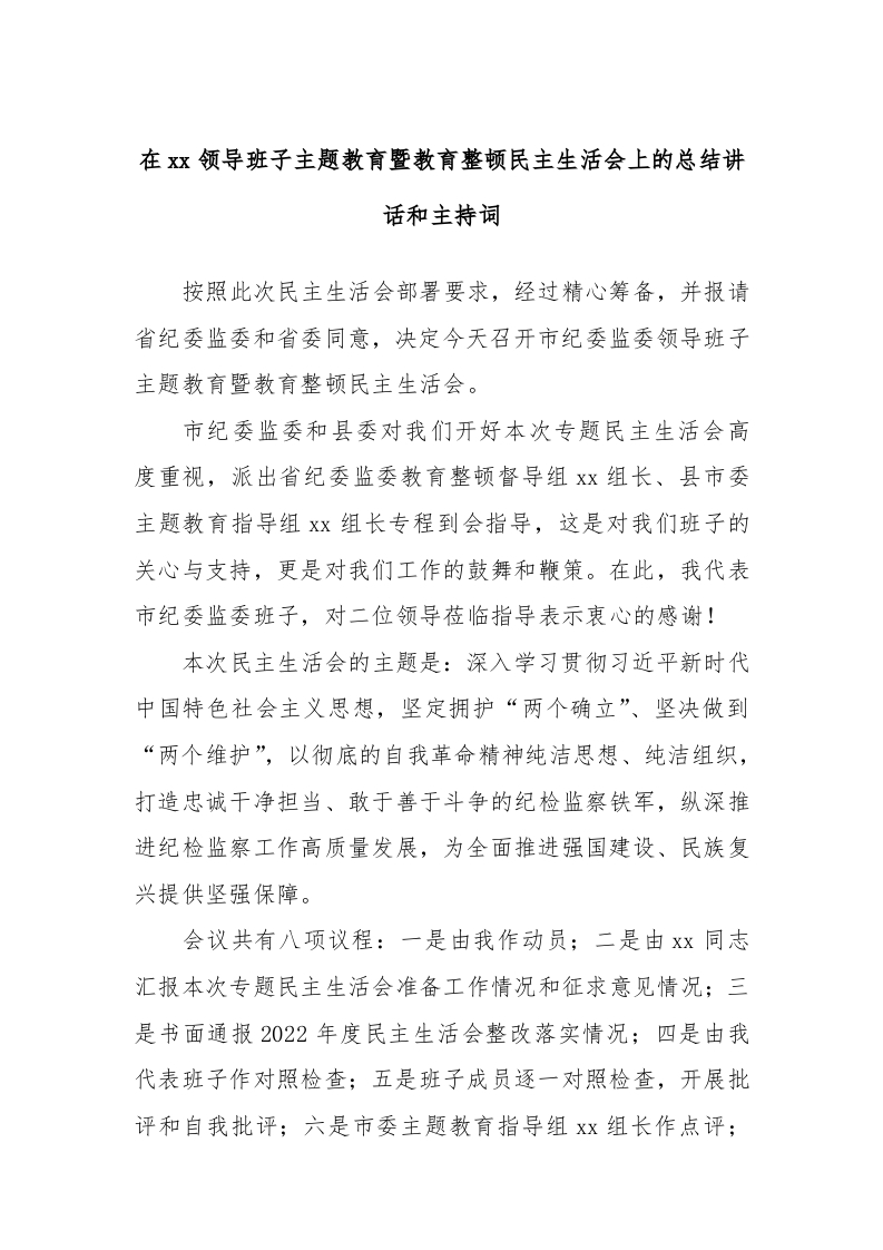 在xx领导班子主题教育暨教育整顿民主生活会上的总结讲话和主持词.