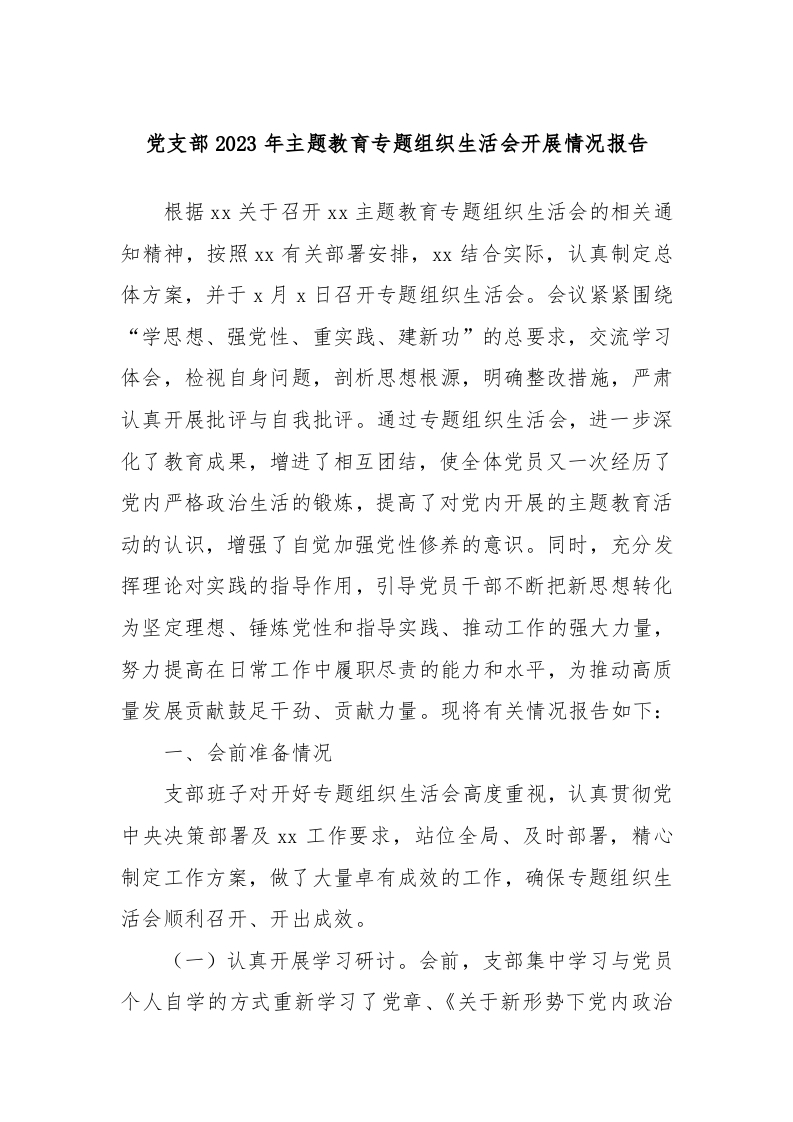 党支部2023年主题教育专题组织生活会开展情况报告.