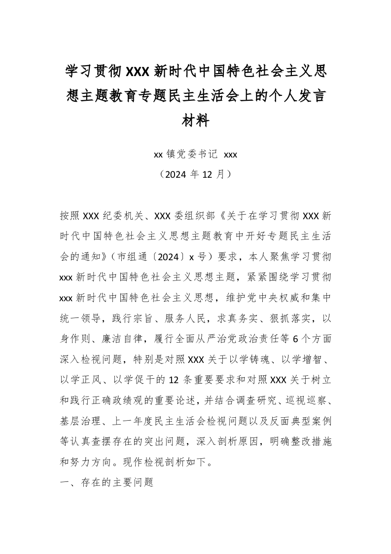 学习贯彻XXX新时代中国特色社会主义思想主题教育专题民主生活会上的个人发言材料
