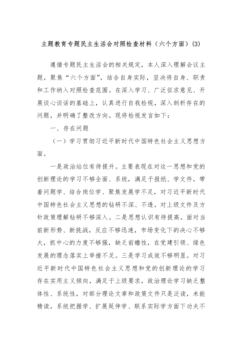 主题教育专题民主生活会对照检查材料(六个方面)(3)