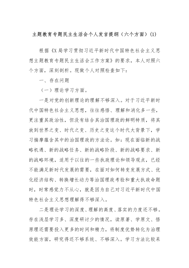 主题教育专题民主生活会个人发言提纲(六个方面)(1)