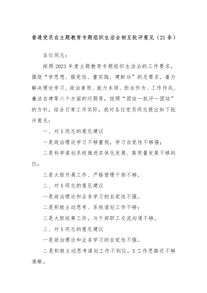 普通党员在主题教育专题组织生活会相互批评意见(21条)