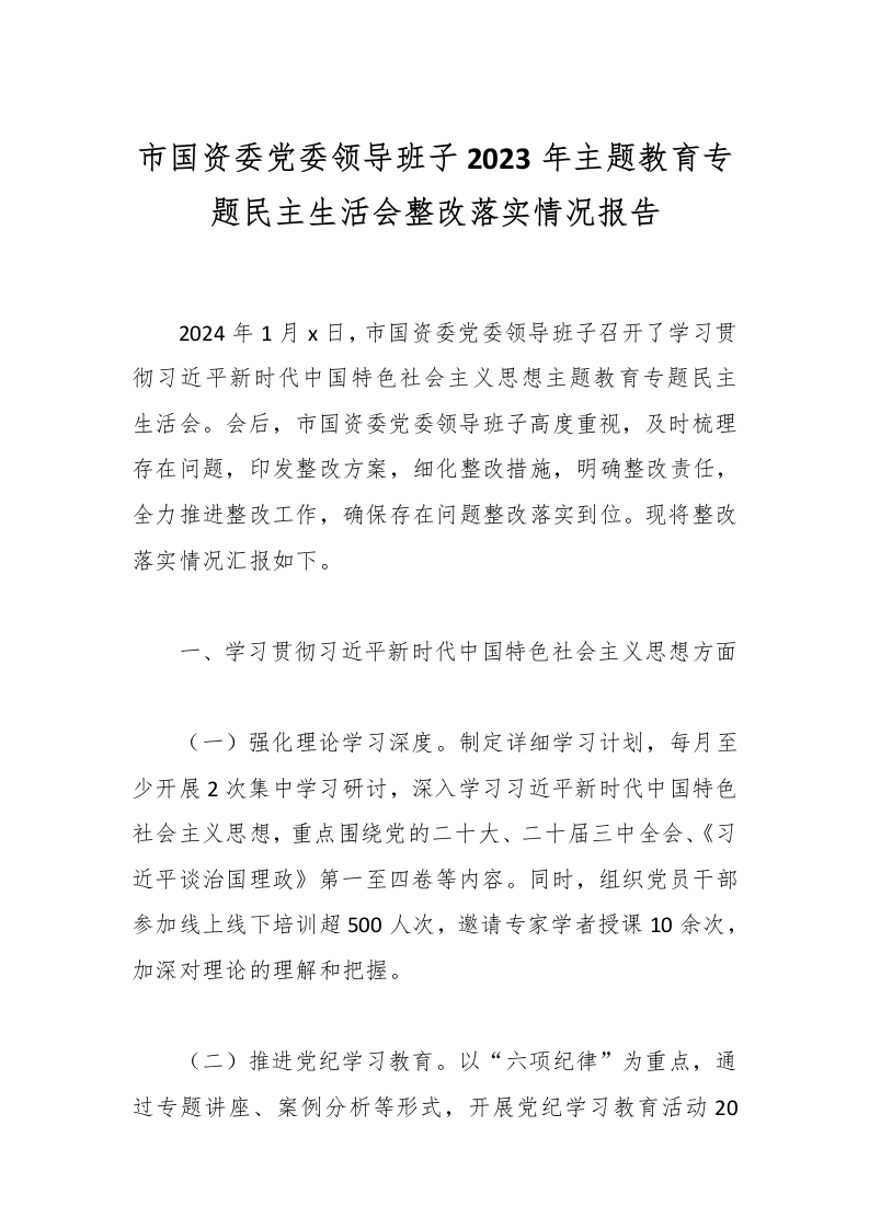 首页精选范文市国资委党委领导班子2023年主题教育专题民主生活会整改落实情况报告