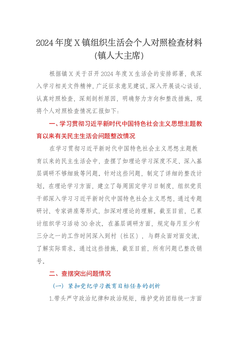 首页写作素材2024年度X镇组织生活会个人对照检查材料主题教育问题整改情况、镇人大主席