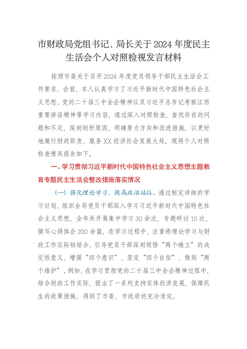 首页写作素材市财政局党组书记、局长关于2024年度民主生活会个人对照检视发言材料主题教育整改措施落实情况+四个带头+以案为鉴、以案促改促治