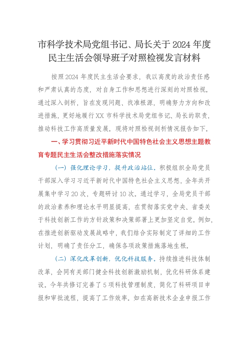 首页写作素材市科学技术局党组书记、局长关于2024年度民主生活会领导班子对照检视发言材料主题教育整改措施落实情况+四个带头+以典型案例举一反三剖析