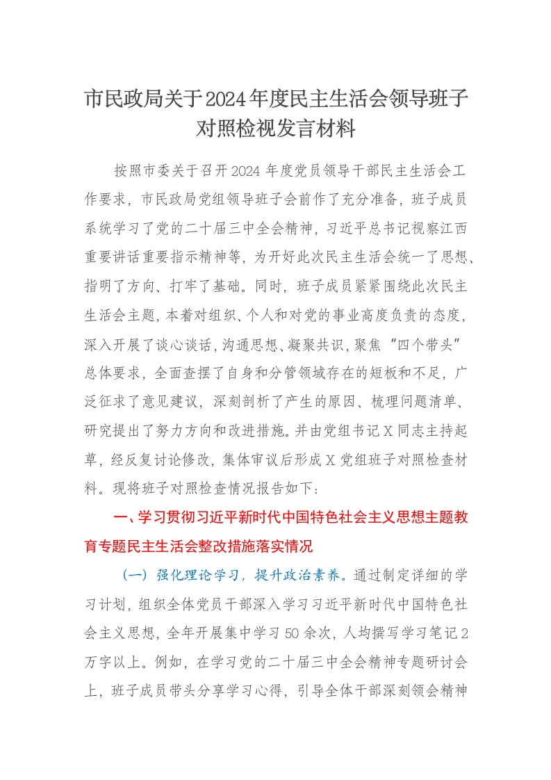 首页写作素材市民政局关于2024年度民主生活会领导班子对照检视发言材料主题教育整改措施落实情况+四个带头+以典型案例举一反三剖析