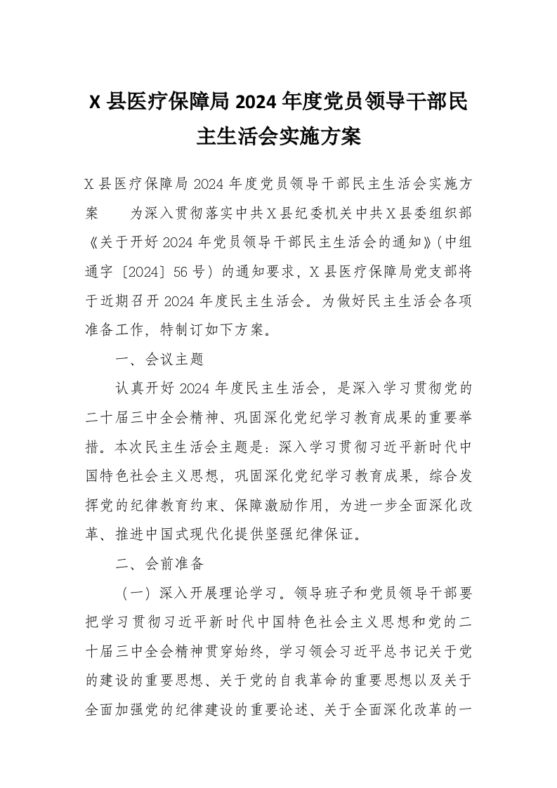 X县医疗保障局2024年度党员领导干部民主生活会实施方案