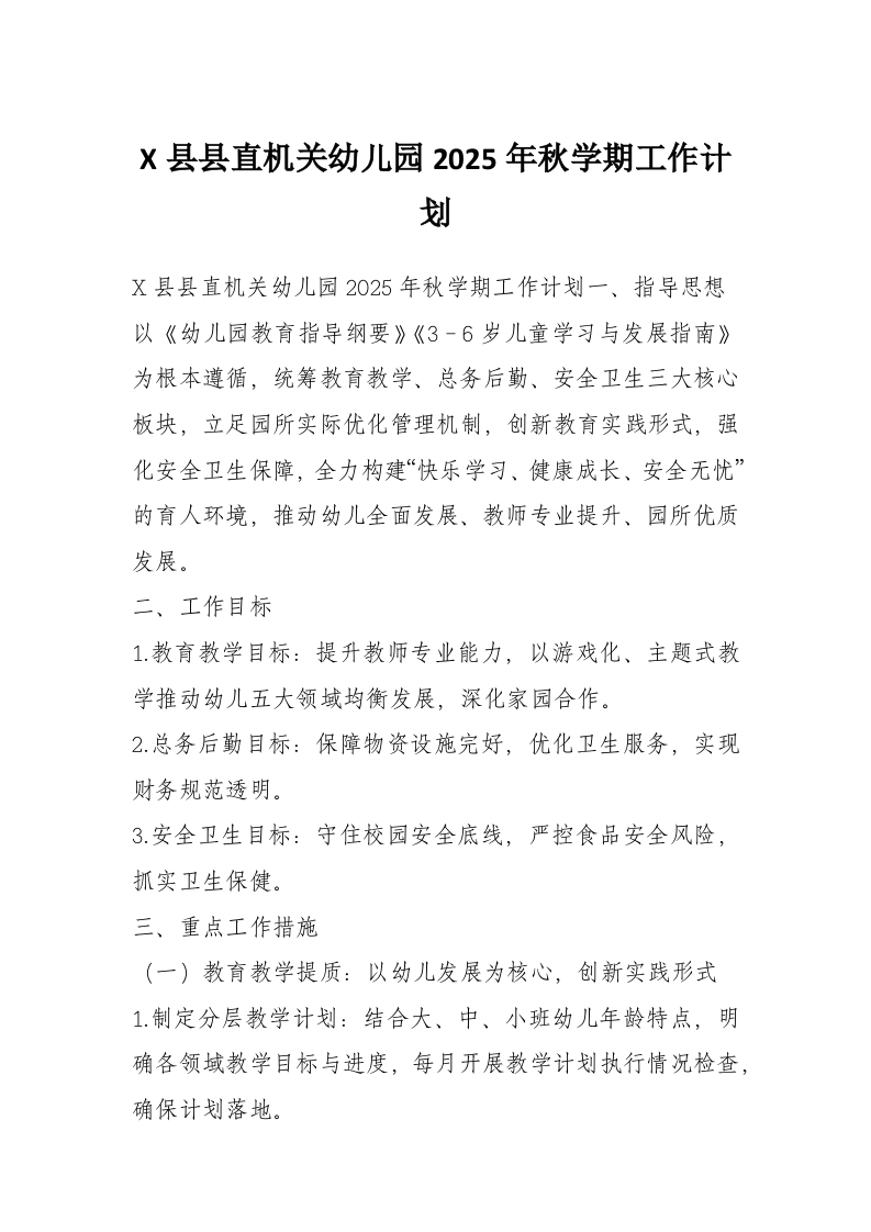 首页工作文档X县县直机关幼儿园2025年秋学期工作计划