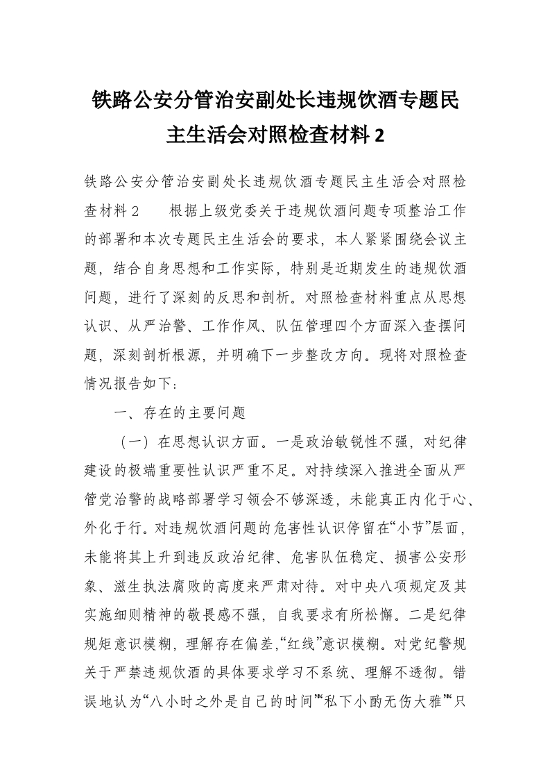 首页学习提升铁路公安分管治安副处长违规饮酒专题民主生活会对照检查材料2