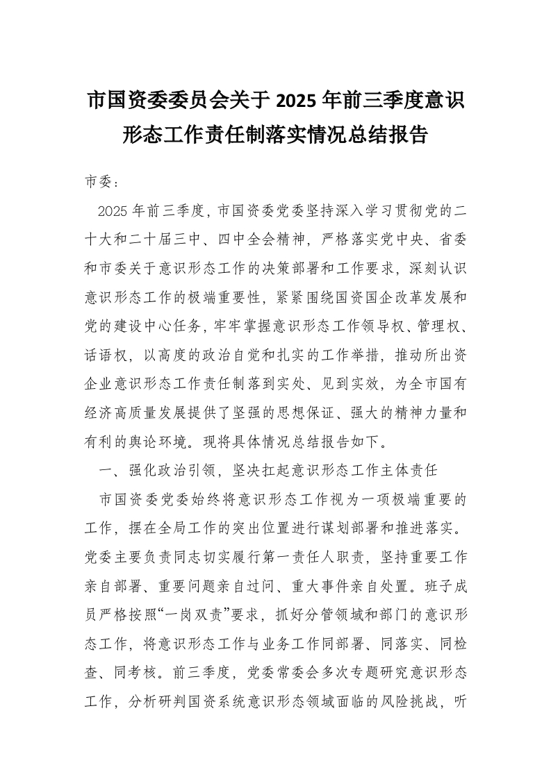 市国资委委员会关于2025年前三季度意识形态工作责任制落实情况总结报告