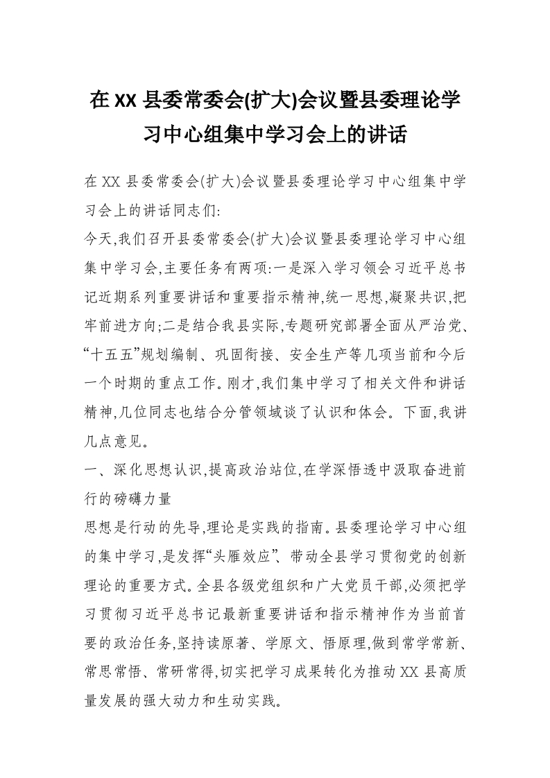 首页材料汇编在XX县委常委会(扩大)会议暨县委理论学习中心组集中学习会上的讲话
