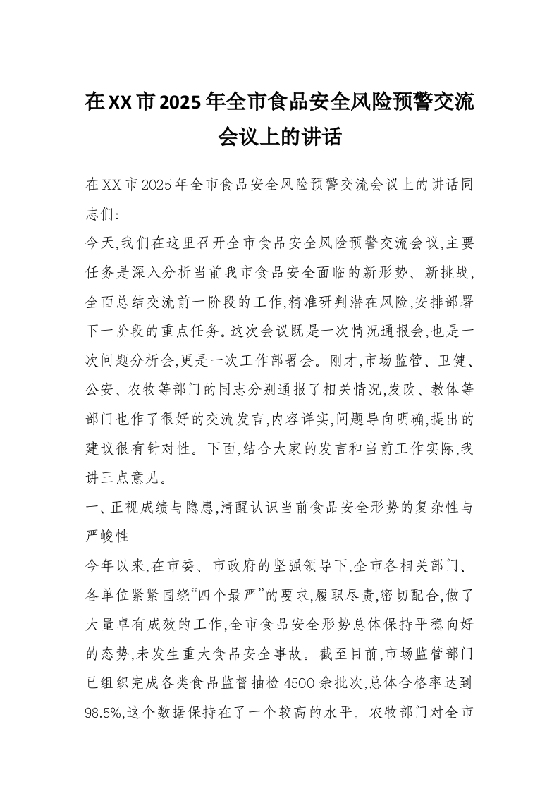 在XX市2025年全市食品安全风险预警交流会议上的讲话