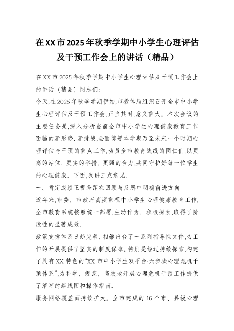 在XX市2025年秋季学期中小学生心理评估及干预工作会上的讲话(精品)