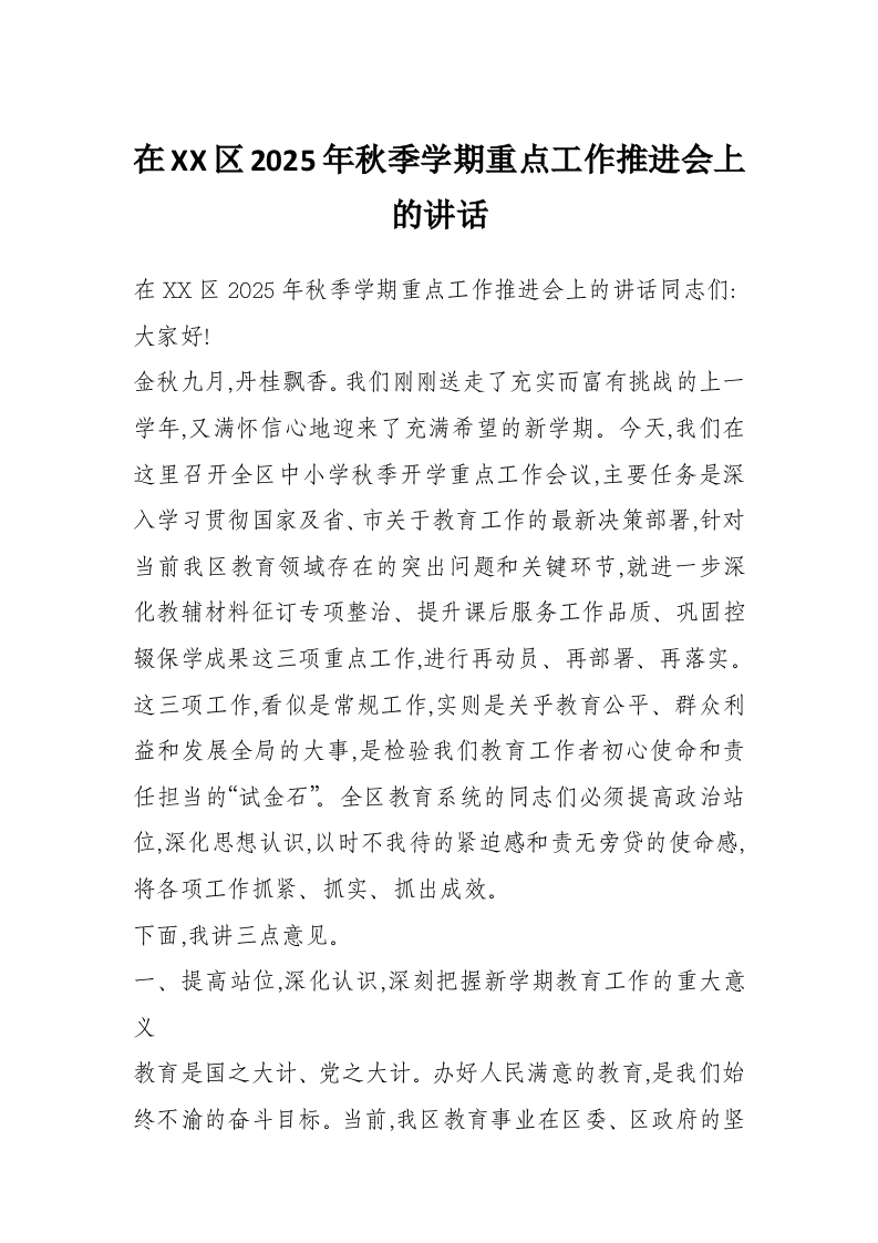 在XX区2025年秋季学期重点工作推进会上的讲话