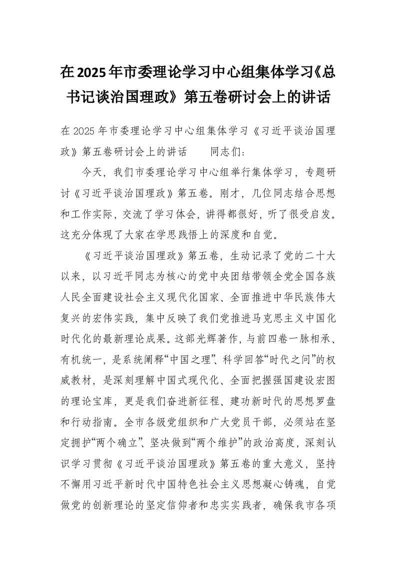 在2025年市委理论学习中心组集体学习《总书记谈治国理政》第五卷研讨会上的讲话