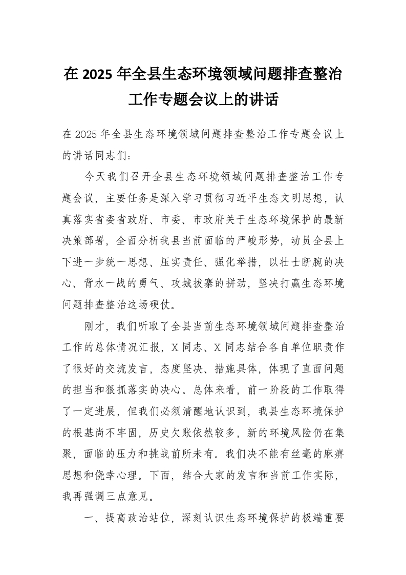 在2025年全县生态环境领域问题排查整治工作专题会议上的讲话