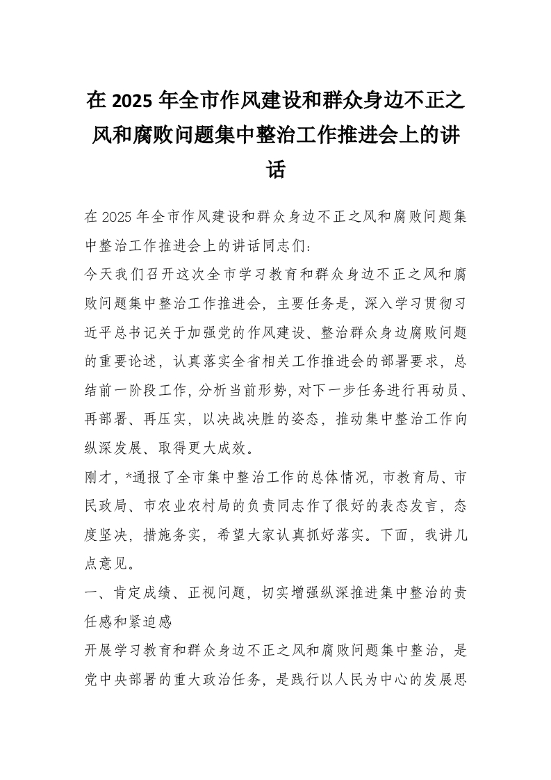 在2025年全市作风建设和群众身边不正之风和腐败问题集中整治工作推进会上的讲话