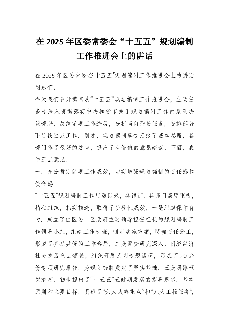 在2025年区委常委会“十五五”规划编制工作推进会上的讲话