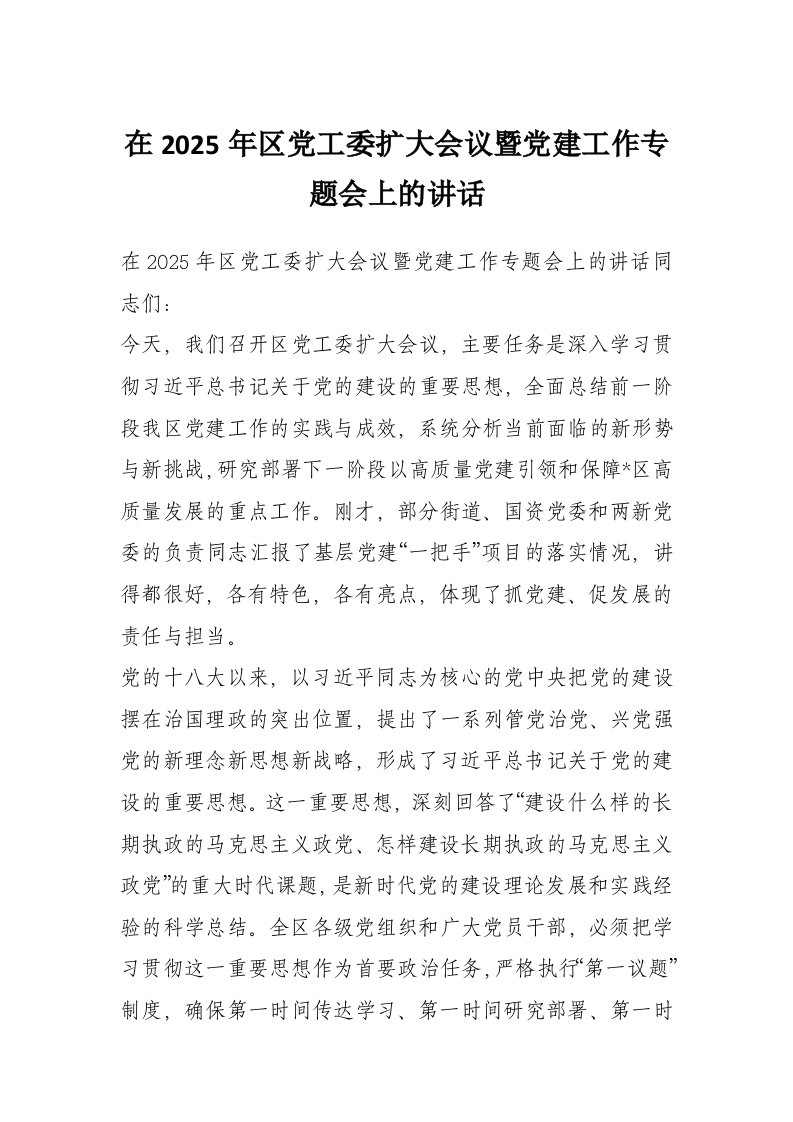 在2025年区党工委扩大会议暨党建工作专题会上的讲话