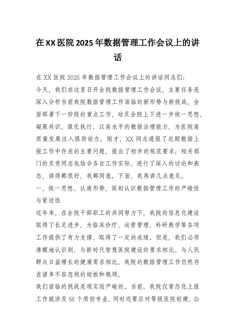 在XX医院2025年数据管理工作会议上的讲话