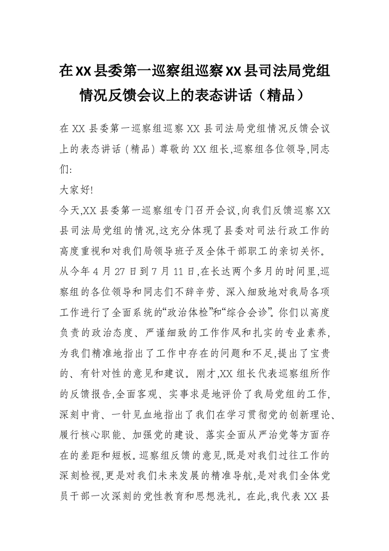 在XX县委第一巡察组巡察XX县司法局党组情况反馈会议上的表态讲话(精品)