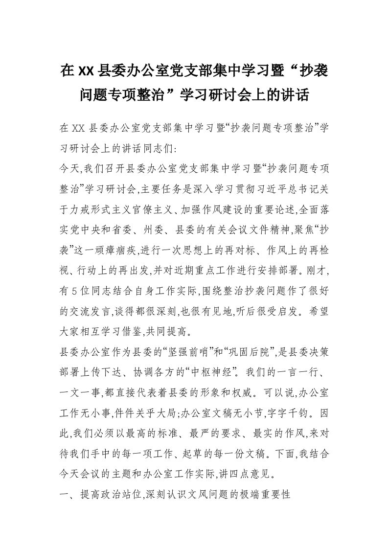 在XX县委办公室党支部集中学习暨“公文抄袭问题专项整治”学习研讨会上的讲话