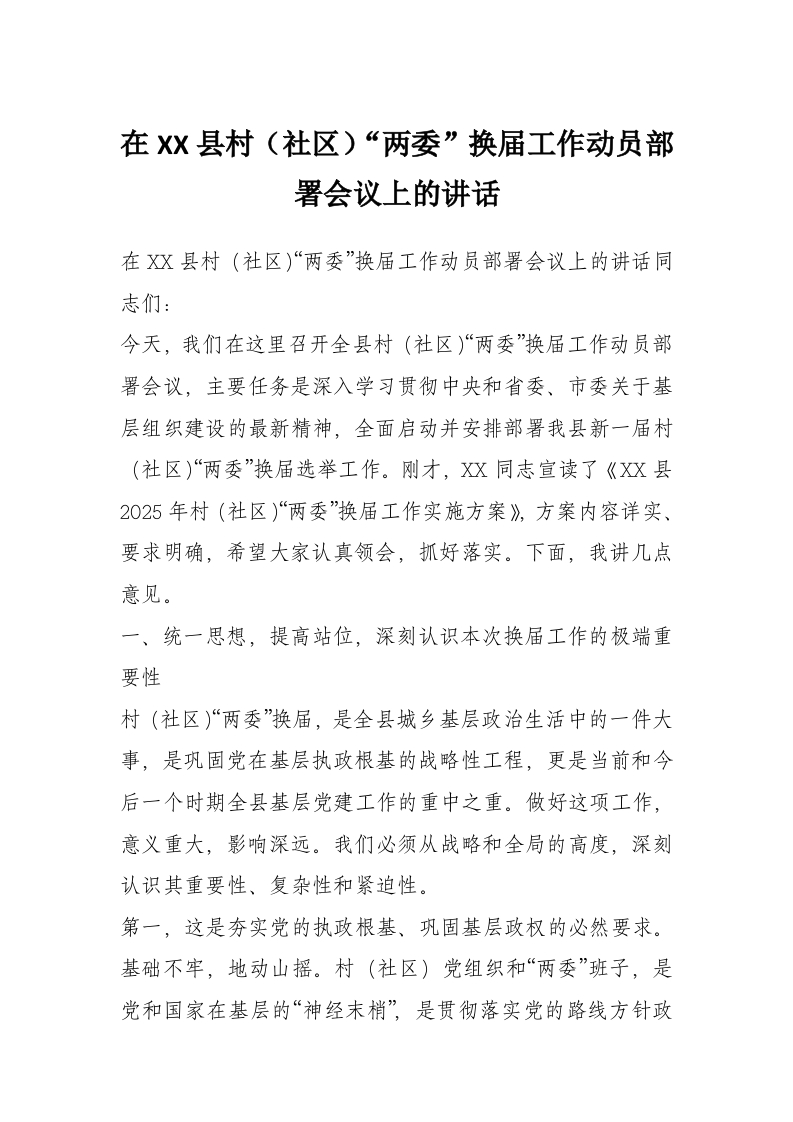 在XX县村(社区)“两委”换届工作动员部署会议上的讲话