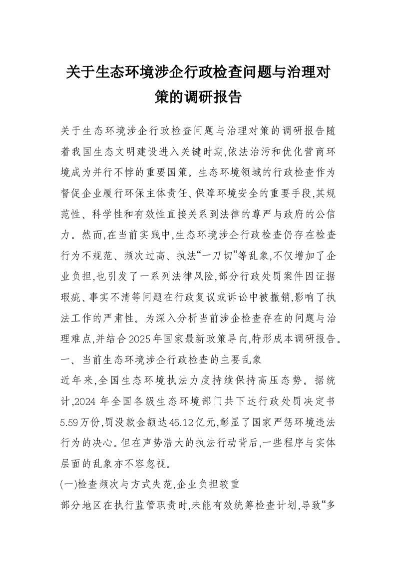 关于生态环境涉企行政检查问题与治理对策的调研报告