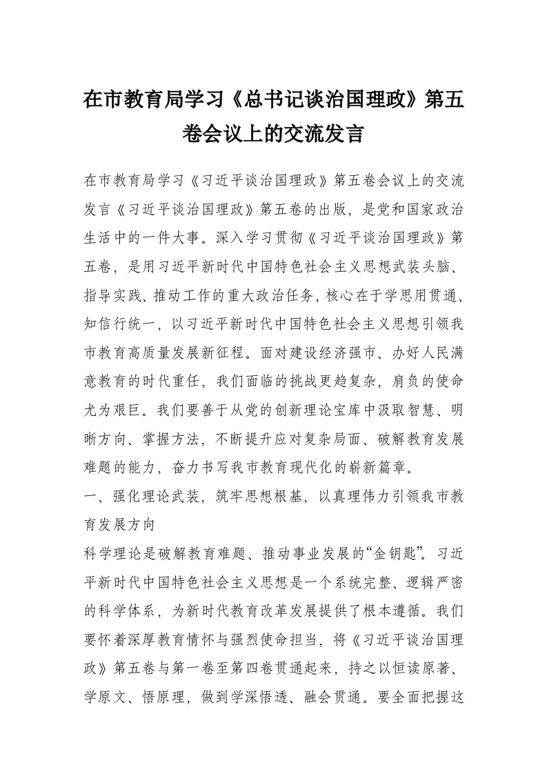 首页讲课讲稿在市教育局学习《总书记谈治国理政》第五卷会议上的交流发言