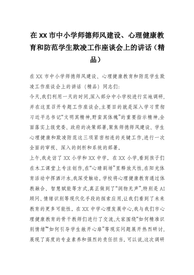 在XX市中小学师德师风建设、心理健康教育和防范学生欺凌工作座谈会上的讲话(精品)