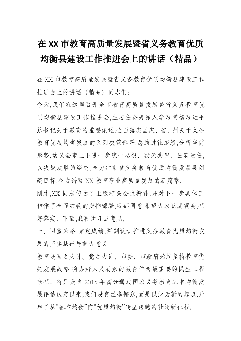 在XX市教育高质量发展暨省义务教育优质均衡县建设工作推进会上的讲话(精品)