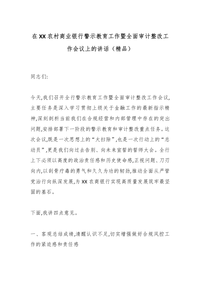 在XX农村商业银行警示教育工作暨全面审计整改工作会议上的讲话(精品)_副本