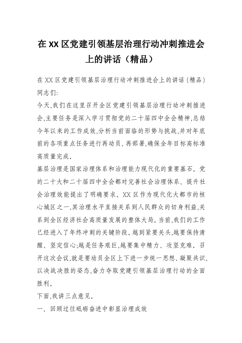 在XX区党建引领基层治理行动冲刺推进会上的讲话(精品)