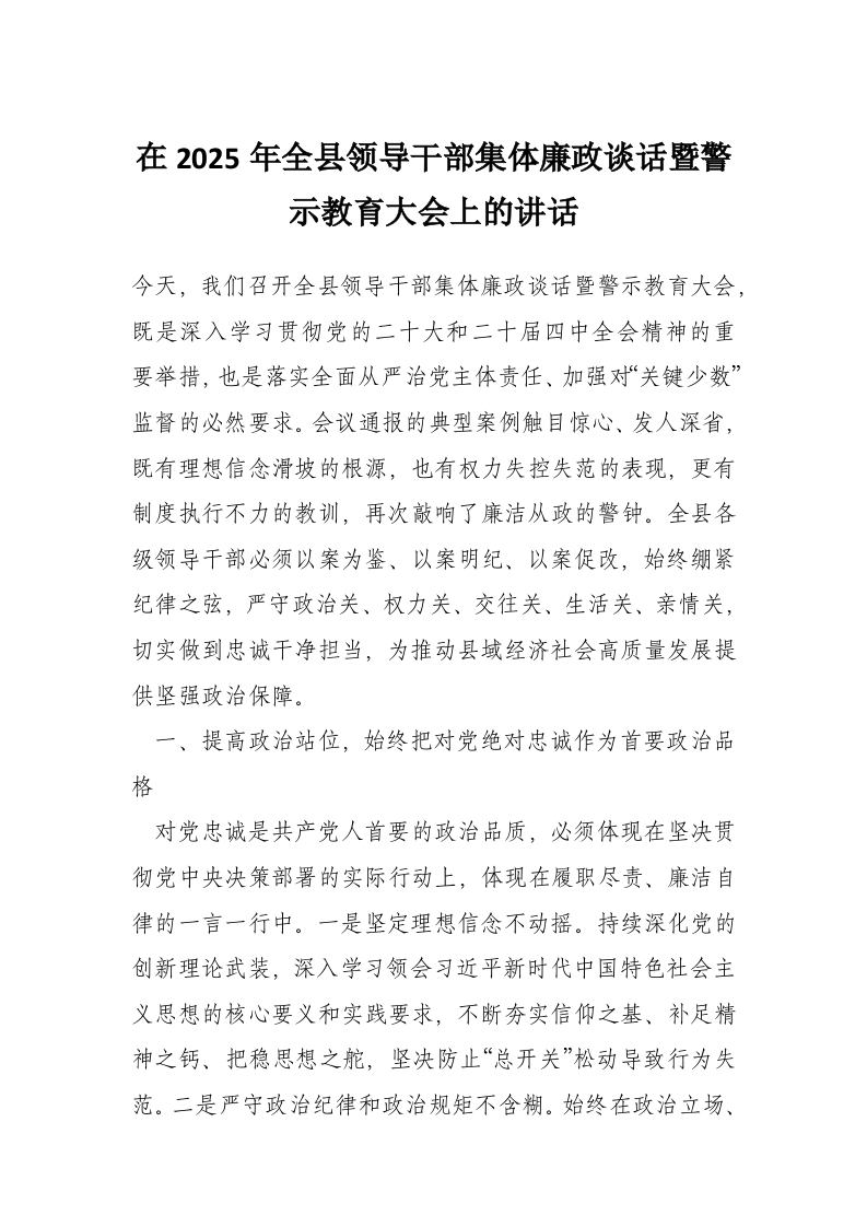 在2025年全县领导干部集体廉政谈话暨警示教育大会上的讲话