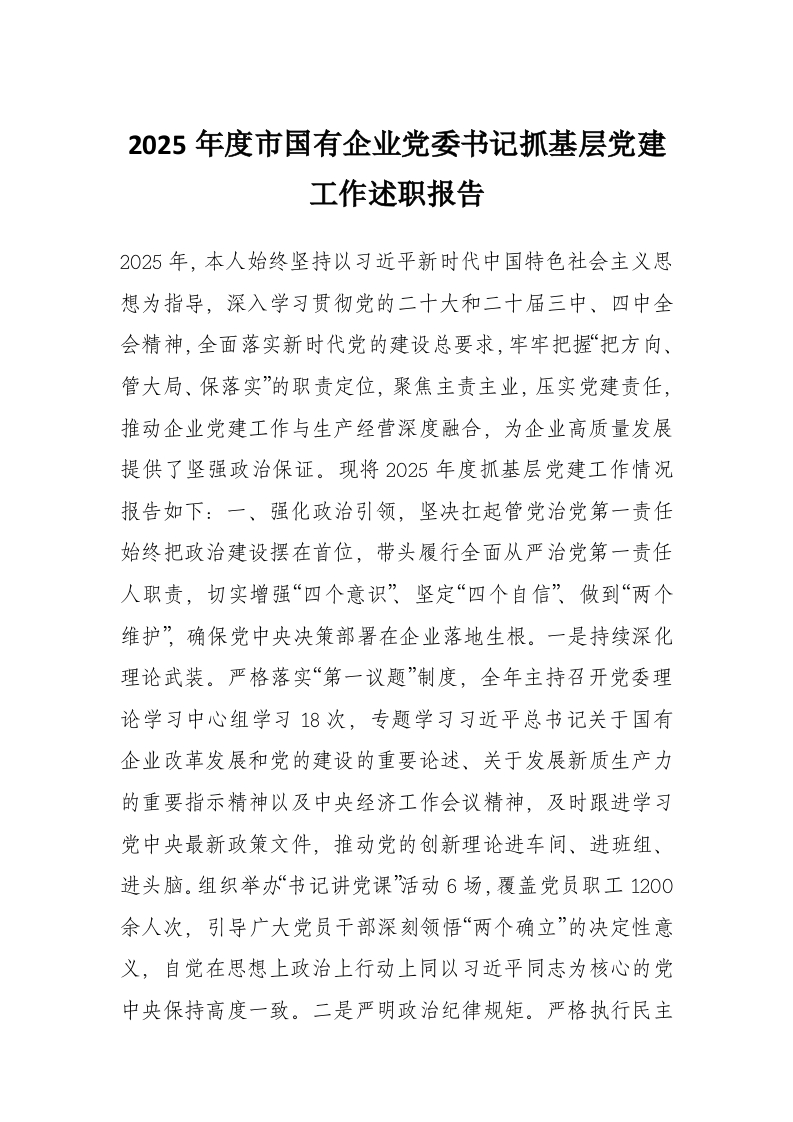 2025年度市国有企业党委书记抓基层党建工作述职报告