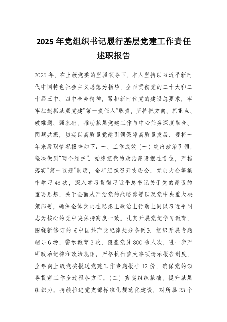 2025年党组织书记履行基层党建工作责任述职报告