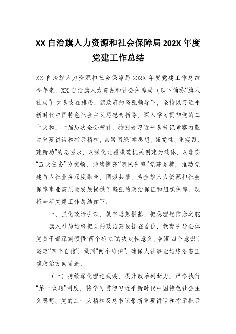 首页学习提升XX自治旗人力资源和社会保障局202X年度党建工作总结