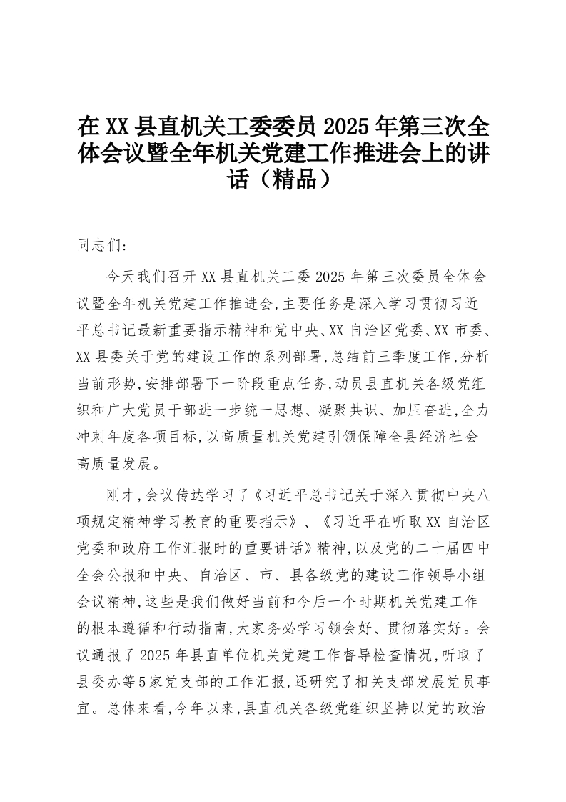 首页工作文档在XX县直机关工委委员2025年第三次全体会议暨全年机关党建工作推进会上的讲话(精品)