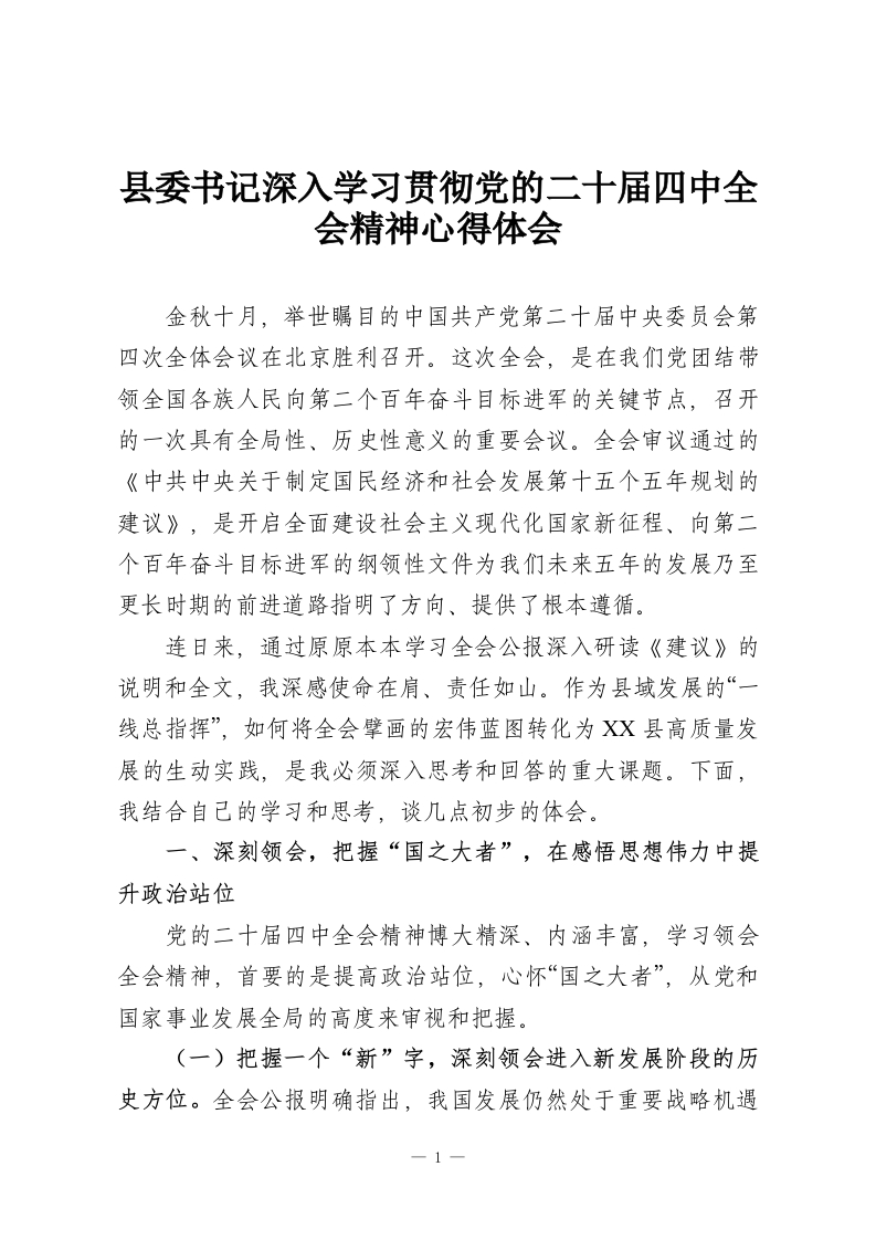 县委书记深入学习贯彻党的二十届四中***精神心得体会