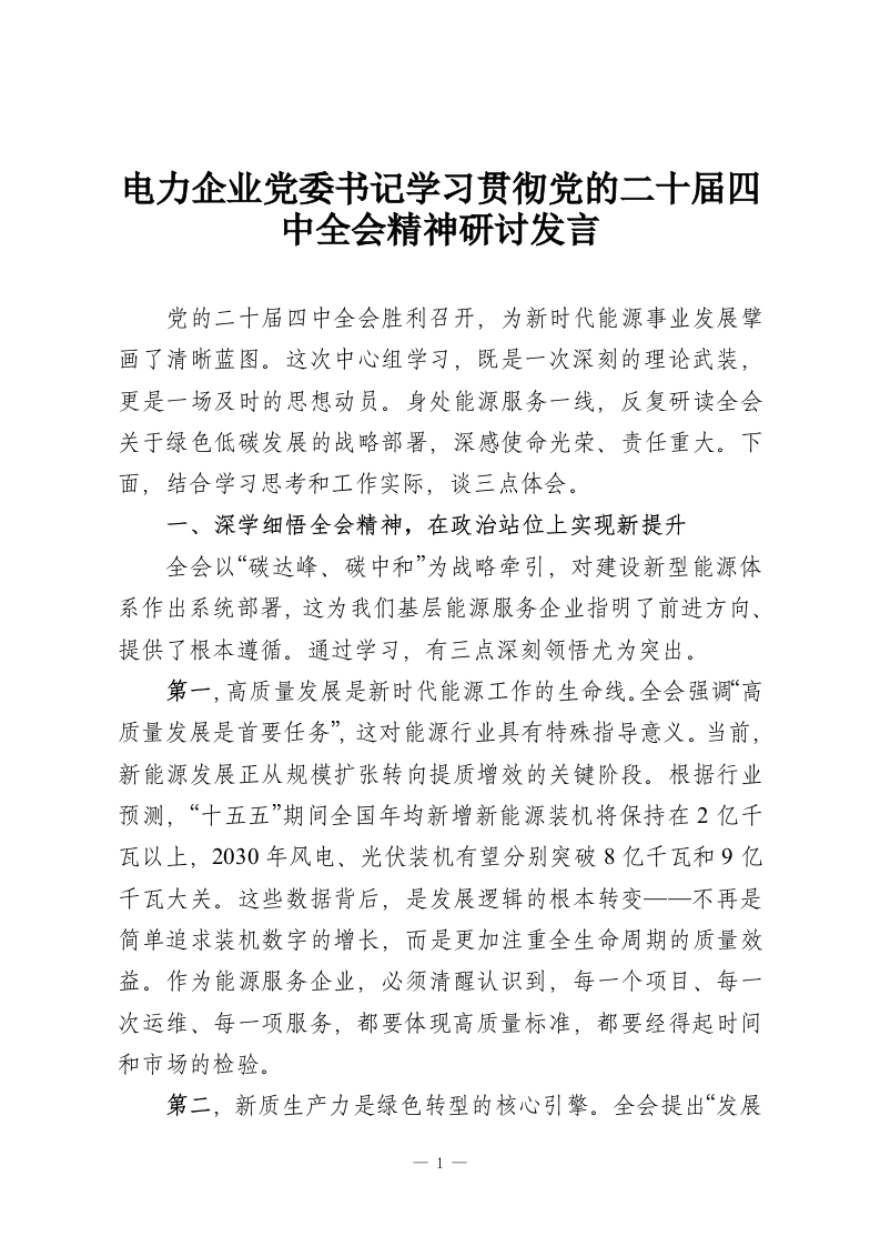 电力企业党委书记学习贯彻党的二十届四中***精神研讨发言
